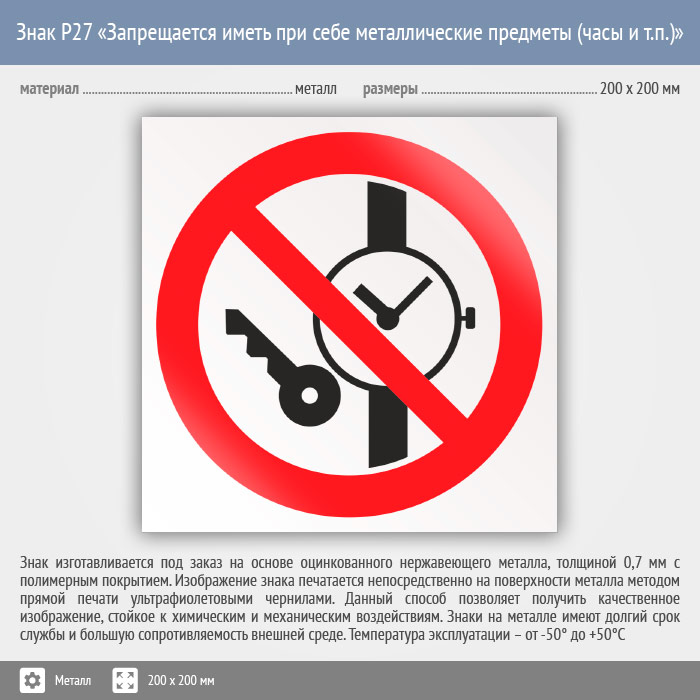 Знак P27 «Запрещается иметь при (на) себе металлические предметы (часы и т.п.)» (металл, 200х200 мм) в Краснодаре купить