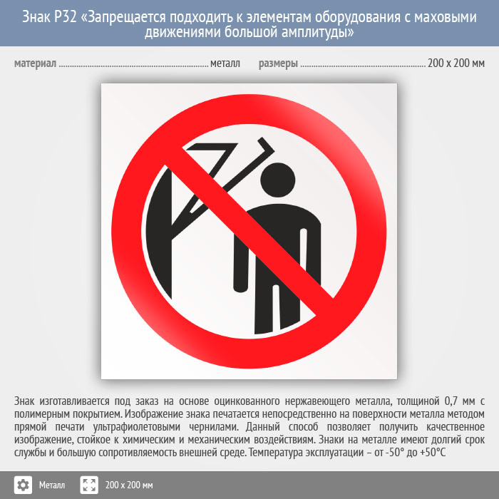 Знак P32 «Запрещается подходить к элементам оборудования с маховыми движениями большой амплитуды» (металл, 200х200 мм) в Краснодаре купить