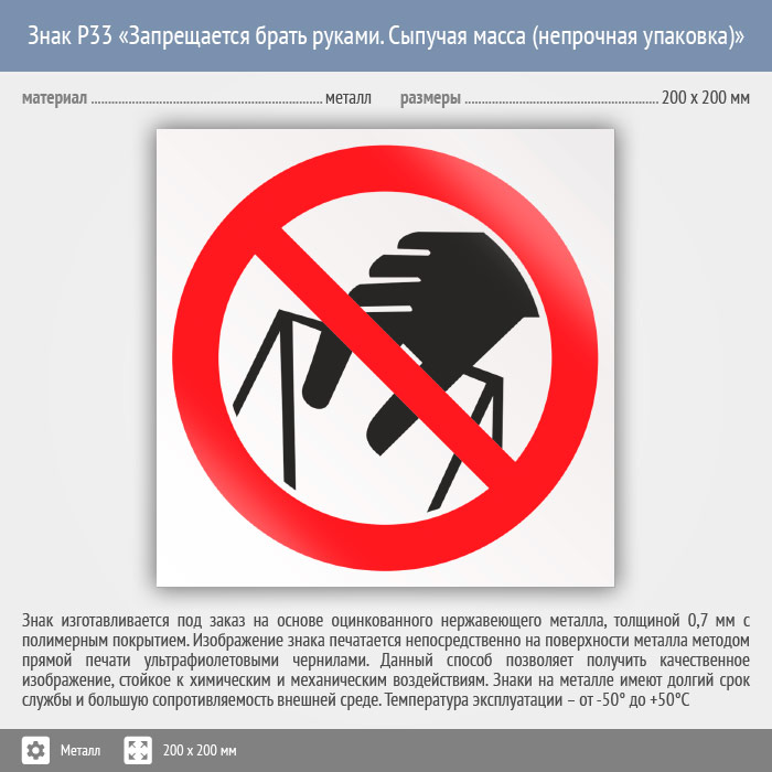 Знак P33 «Запрещается брать руками. Сыпучая масса (непрочная упаковка)» (металл, 200х200 мм) в Краснодаре купить