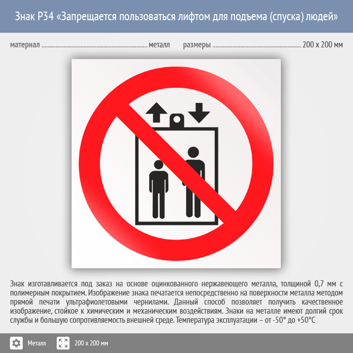 Знак P34 «Запрещается пользоваться лифтом для подъема (спуска) людей» (металл, 200х200 мм) в Краснодаре купить