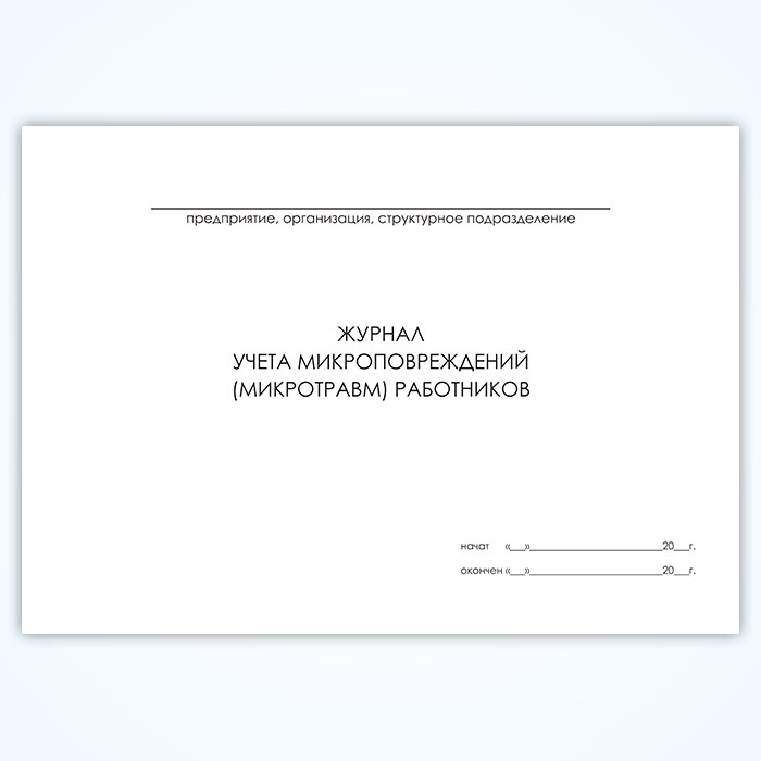 Журнал учета микроповреждений (микротравм) работников является учетным документом, предназначенным для регистрации случаев получения работниками микроповреждений (микротравм) в процессе трудовой деятельности. Микротравма — это повреждение, возникающее в результате воздействия небольших по интенсивности усилий, приводящее к нарушению функции и микроструктуры тканей (острая микротравма — однократное или непродолжительное превышение пределов прочности ткани, хроническая — многократное и длительное воздействие травмирующего агента).