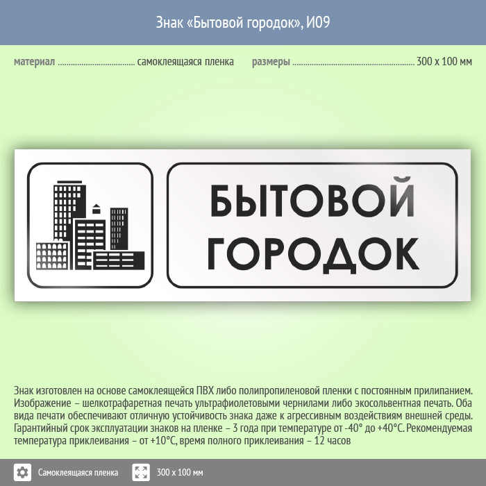 Знак «Бытовой городок» может быть изготовлен любого размера на самоклеящейся пленке, пластике толщиной 0.5, 2 или 4 мм и металле. Также возможно применение фотолюминесцентных и световозвращающих материалов