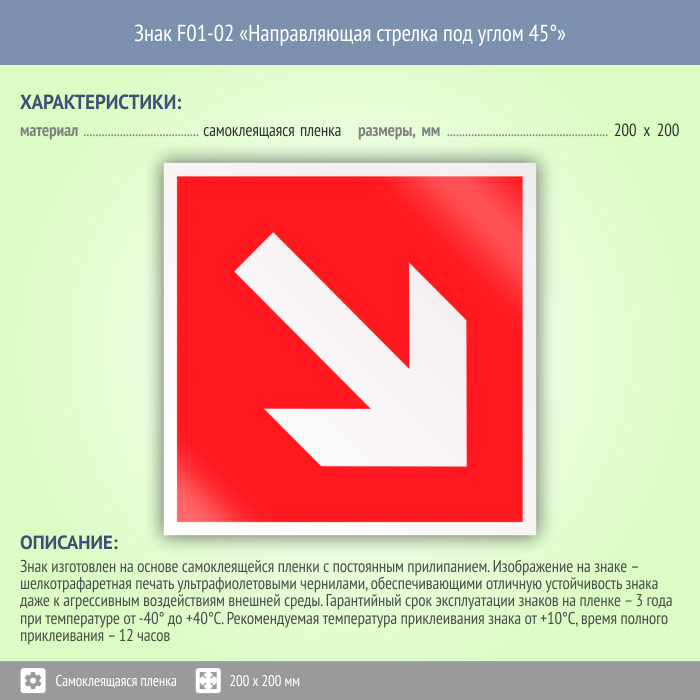 Знак «Направляющая стрелка под углом 45°» может быть изготовлен любого размера на самоклеящейся пленке, пластике толщиной 0.5, 2 или 4 мм и металле. Также возможно применение фотолюминесцентных и световозвращающих материалов
