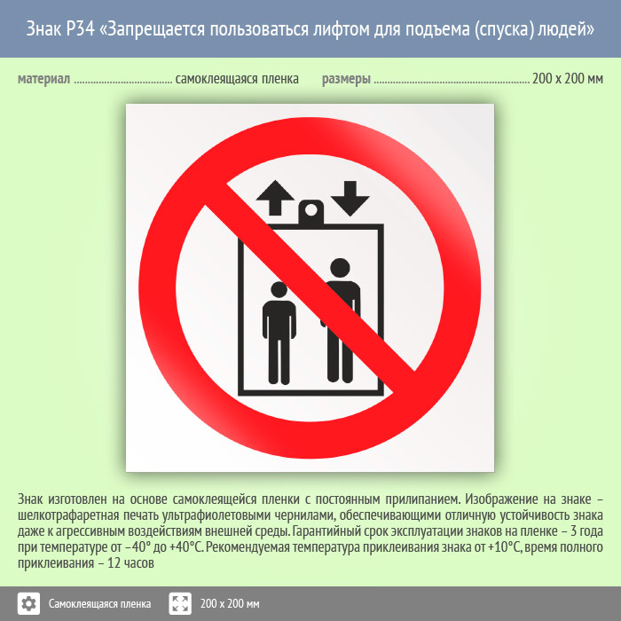 Знак «Запрещается пользоваться лифтом для подъема (спуска) людей» может быть изготовлен любого размера на самоклеящейся пленке, пластике толщиной 0.5, 2 или 4 мм и металле. Также возможно применение фотолюминесцентных и световозвращающих материалов