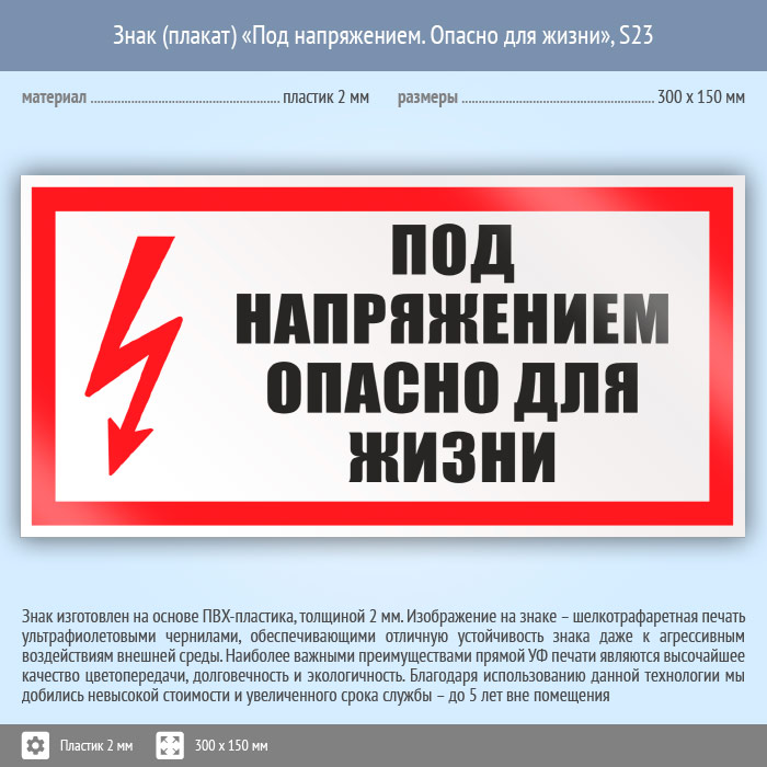 Знак (плакат) «Под напряжением. Опасно для жизни», S23 (пластик, 300х150 мм) в Краснодаре купить