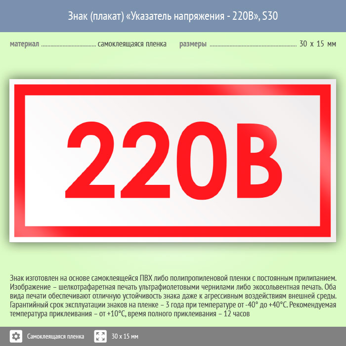 Знак (плакат) «Указатель напряжения - 220В», S30 (50 штук, пленка, 30х15 мм) в Краснодаре купить