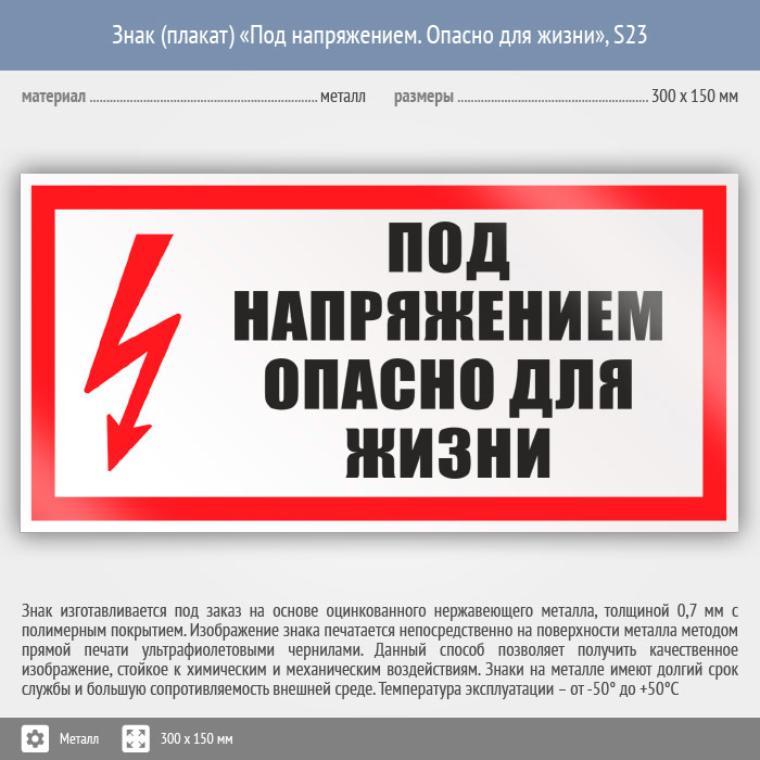 Знак (плакат) «Под напряжением. Опасно для жизни», S23 (металл, 300х150 мм) в Краснодаре купить