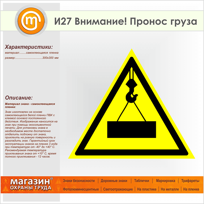 Знак «Внимание! Пронос груза», И27 (пленка, сторона 300 мм) в Краснодаре купить