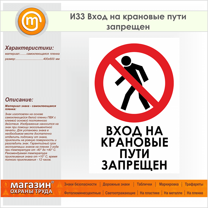 Знак «Вход на крановые пути запрещен», И33 (пленка, 400х600 мм) в Краснодаре купить