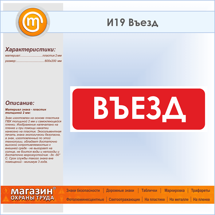 Знак «Въезд», И19 (пластик, 600х200 мм) в Краснодаре купить