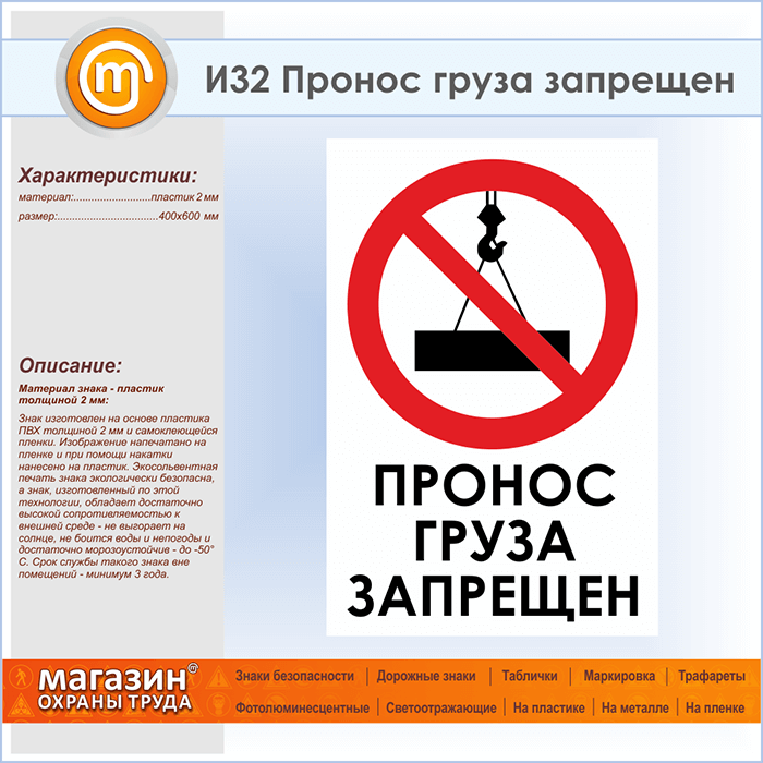 Знак «Пронос груза запрещен», И32 (пластик, 400х600 мм) в Краснодаре купить