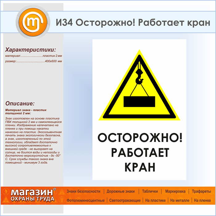 Знак «Осторожно! Работает кран», И34 (пластик, 400х600 мм) в Краснодаре купить