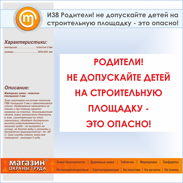 Знак «Родители! не допускайте детей на строительную площадку - это опасно!», И38 (пластик, 600х400 мм) в Краснодаре купить