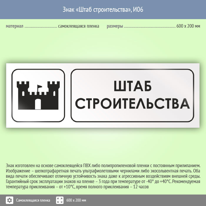 Знак «Штаб строительства», И06 (пленка, 600х200 мм) в Краснодаре купить