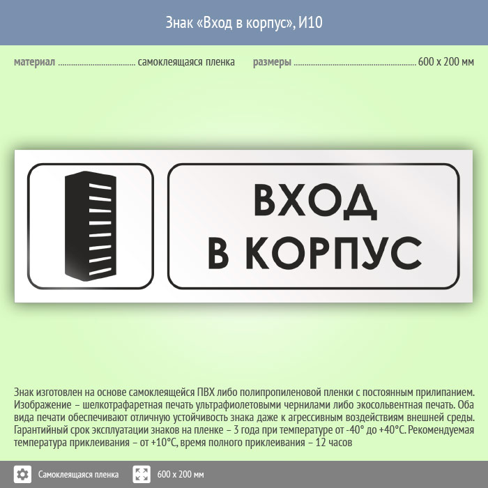 Знак «Вход в корпус», И10 (пленка, 600х200 мм) в Краснодаре купить