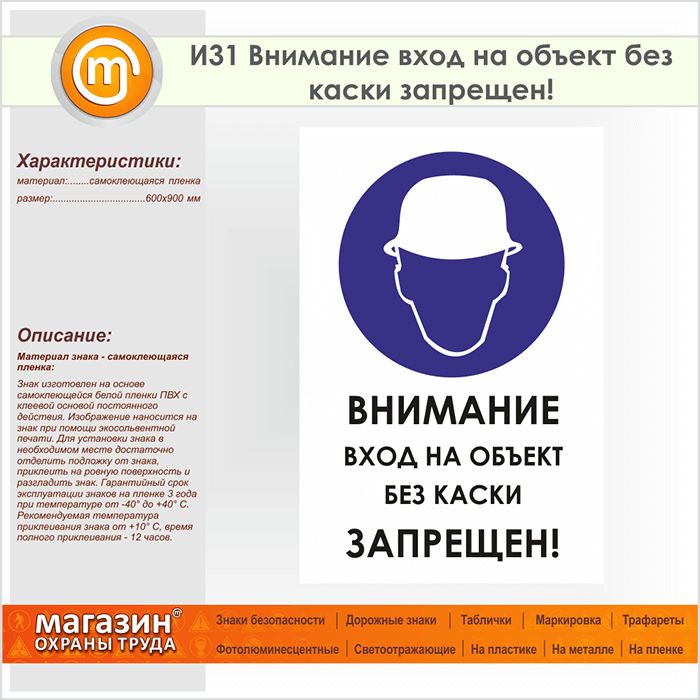 Знак «Внимание вход на объект без каски запрещен!», И31 (пленка, 600х900 мм) в Краснодаре купить