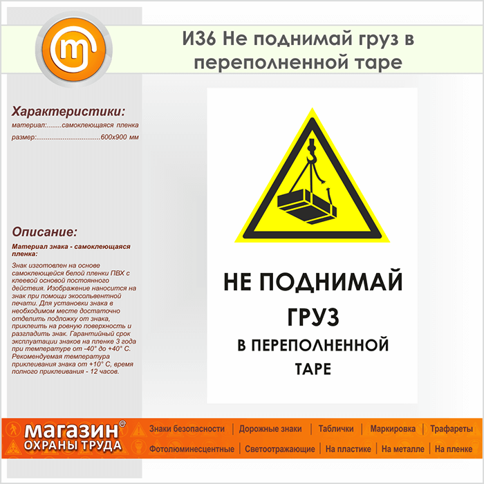 Знак «Не поднимай груз в переполненной таре», И36 (пленка, 600х900 мм) в Краснодаре купить