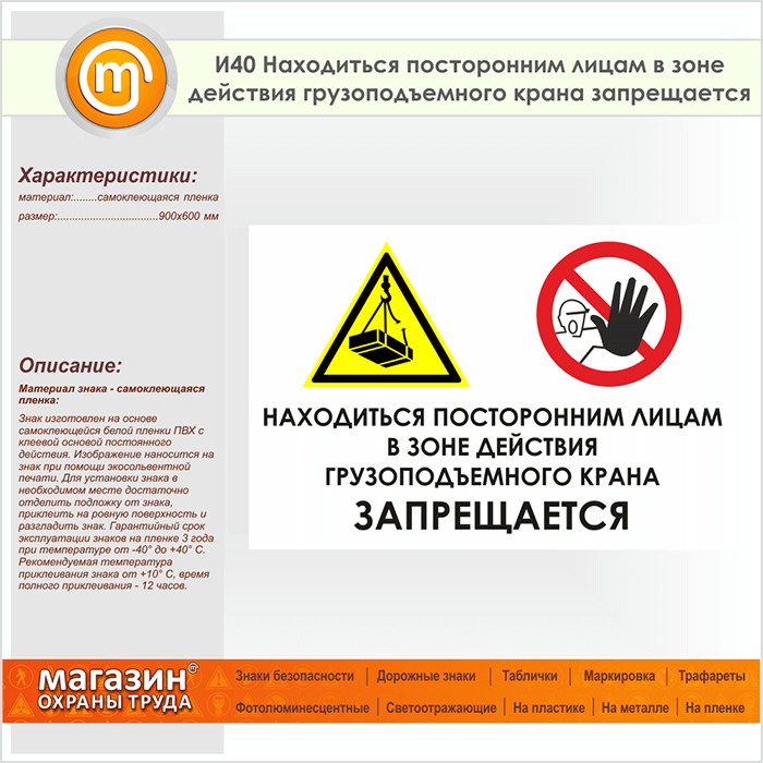 Знак «Находиться посторонним лицам в зоне действия грузоподъемного крана запрещается», И40 (пленка, 900х600 мм) в Краснодаре купить