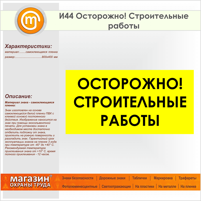 Знак «Осторожно! Строительные работы», И44 (пленка, 800х400 мм) в Краснодаре купить