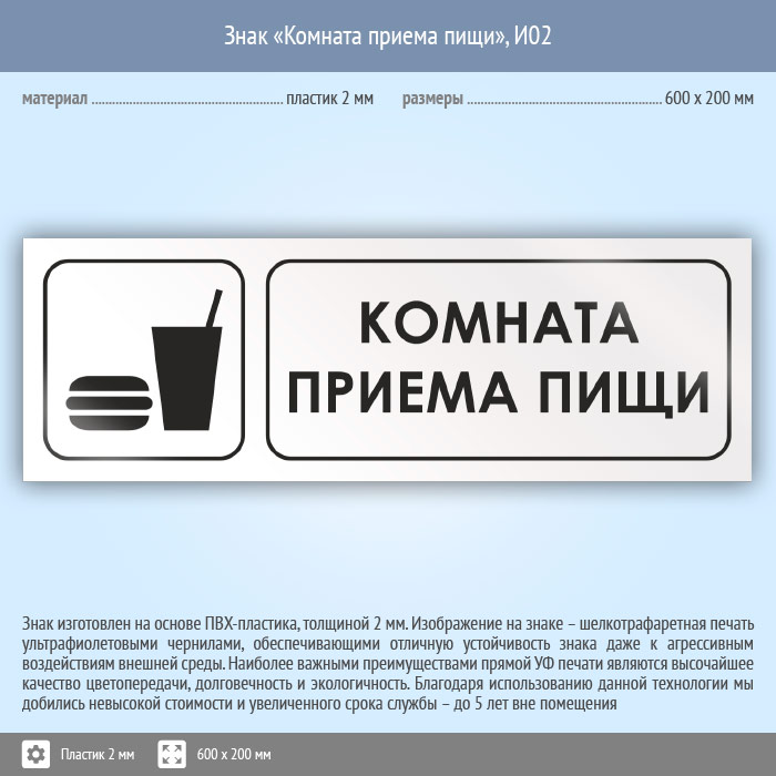 Знак «Комната приема пищи», И02 (пластик, 600х200 мм) в Краснодаре купить