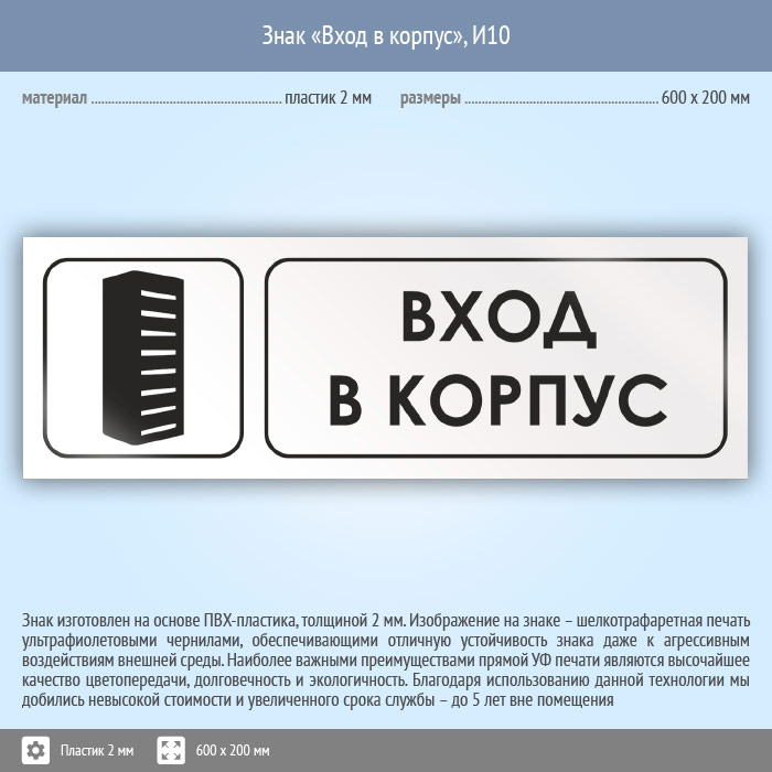 Знак «Вход в корпус», И10 (пластик, 600х200 мм) в Краснодаре купить