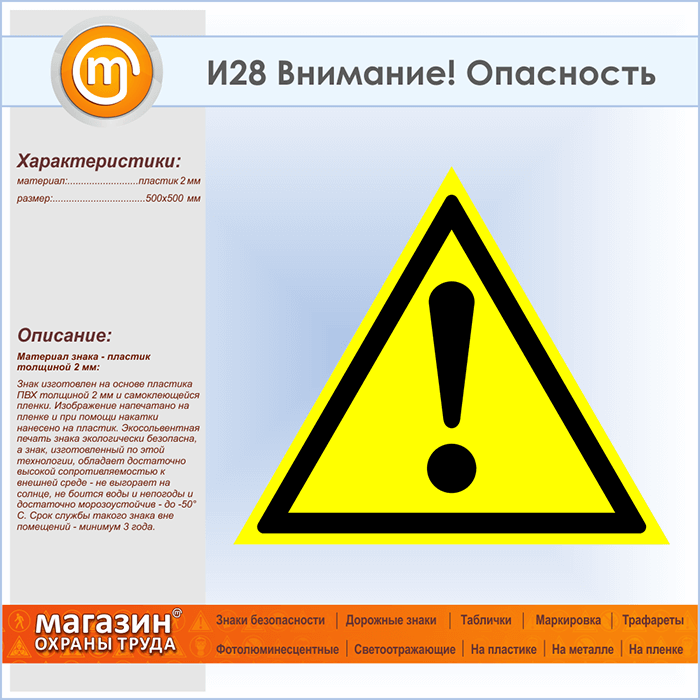 Знак «Внимание! Опасность», И28 (пластик, сторона 500 мм) в Краснодаре купить