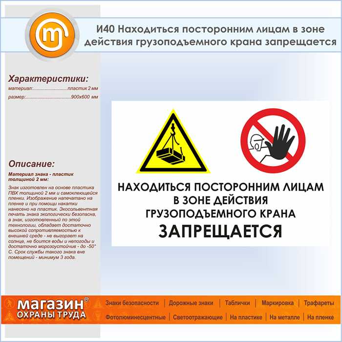 Знак «Находиться посторонним лицам в зоне действия грузоподъемного крана запрещается», И40 (пластик, 900х600 мм) в Краснодаре купить