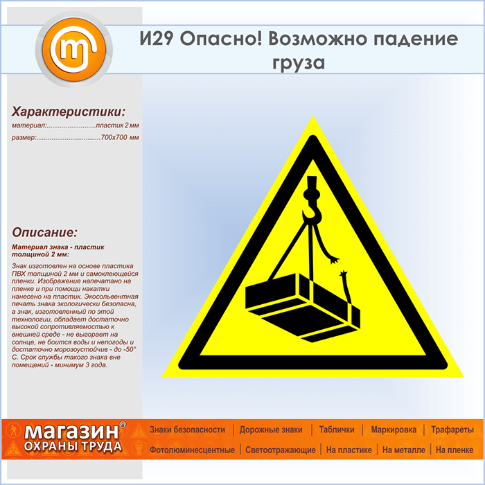 Знак «Опасно! Возможно падение груза», И29 (пластик, сторона 700 мм) в Краснодаре купить