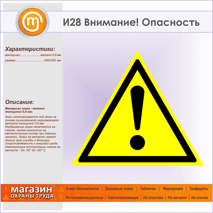 Знак «Внимание! Опасность», И28 (металл, сторона 500 мм) в Краснодаре купить