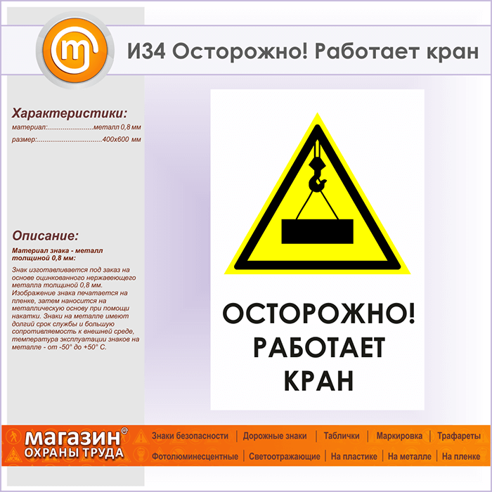 Знак «Осторожно! Работает кран», И34 (металл, 400х600 мм) в Краснодаре купить