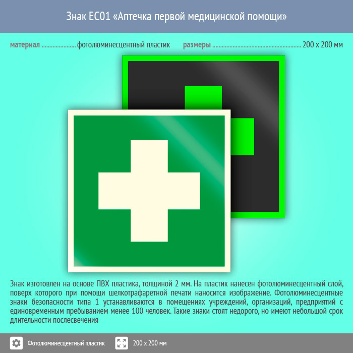 Знак EC01 «Аптечка первой медицинской помощи» (фотолюминесцентный пластик, 200х200 мм) в Краснодаре купить