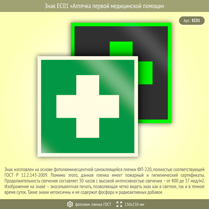 Знак EC01 «Аптечка первой медицинской помощи» (фотолюминесцентная пленка ГОСТ 34428-2018, 150х150 мм) в Краснодаре купить