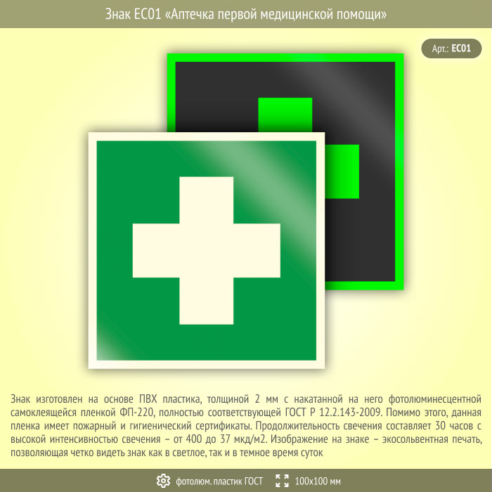 Знак EC01 «Аптечка первой медицинской помощи» (фотолюминесцентный пластик ГОСТ 34428-2018, 100х100 мм) в Краснодаре купить