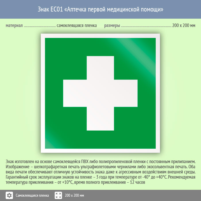 Знак EC01 «Аптечка первой медицинской помощи» (пленка, 200х200 мм) в Краснодаре купить