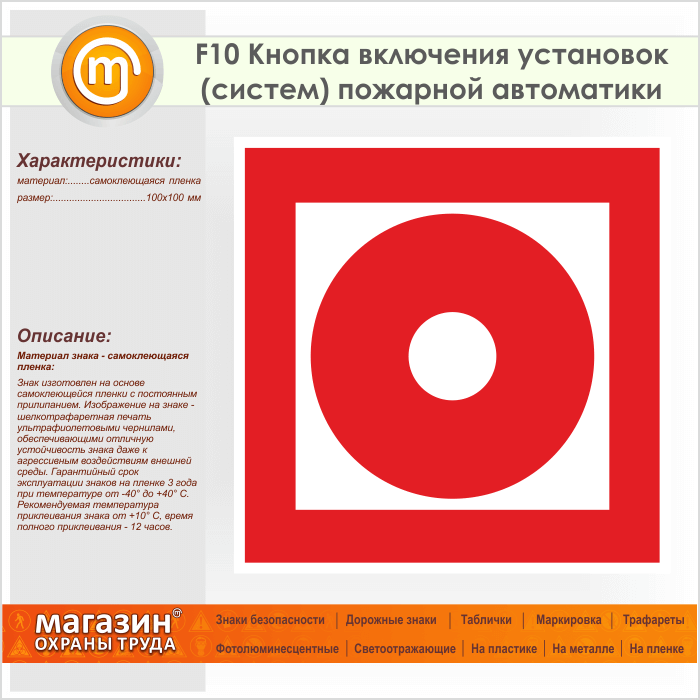 Знак F10 «Кнопка включения установок (систем) пожарной автоматики» (пленка, 100х100 мм) в Краснодаре купить