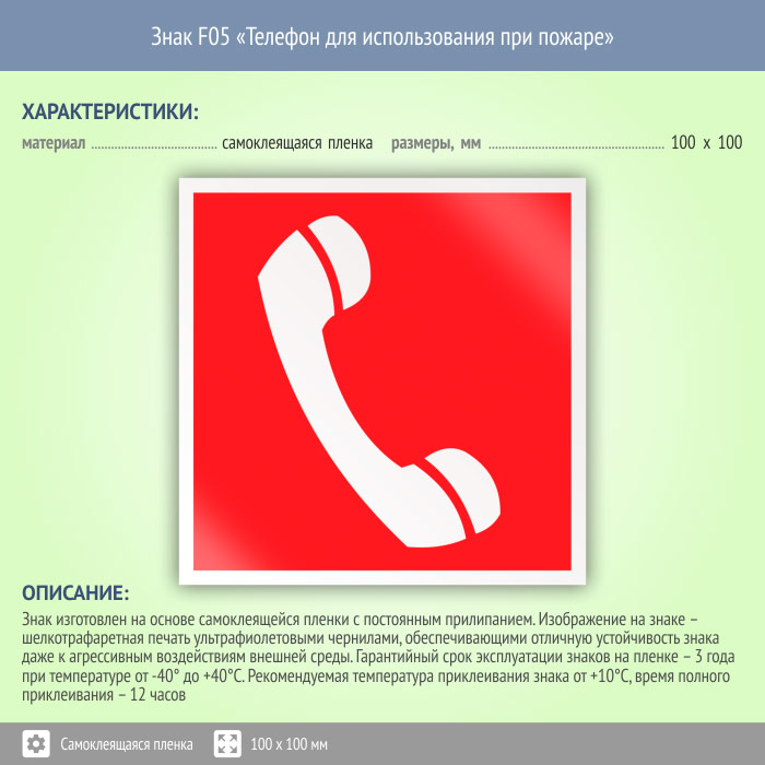 Знак F05 «Телефон для использования при пожаре (в том числе телефон прямой связи с пожарной охраной)» (пленка, 100х100 мм) в Краснодаре купить