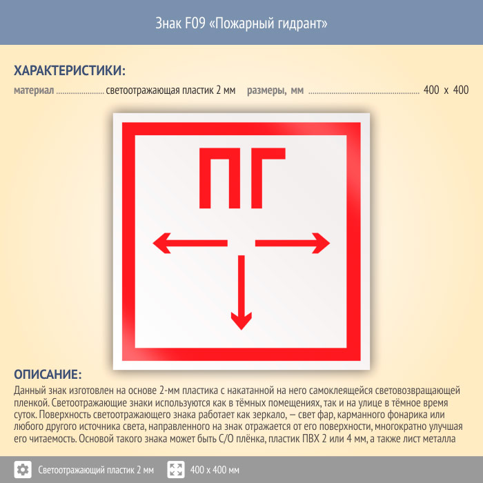 Знак F09 «Пожарный гидрант» (светоотражающий пластик, 400х400 мм) в Краснодаре купить