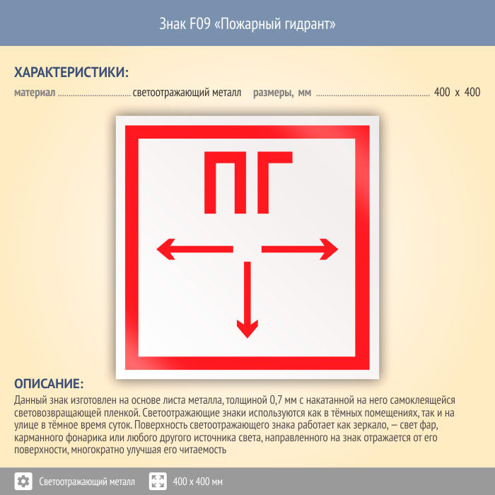 Знак F09 «Пожарный гидрант» (светоотражающий металл, 400х400 мм) в Краснодаре купить