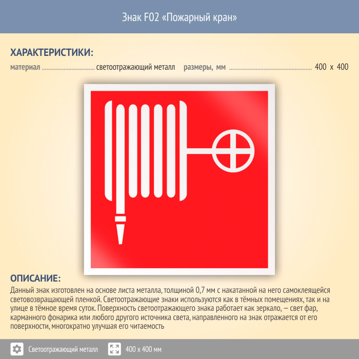Знак F02 «Пожарный кран» (светоотражающий металл, 400х400 мм) в Краснодаре купить