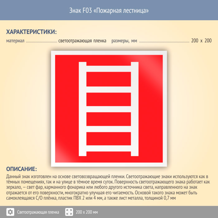 Знак F03 «Пожарная лестница» (светоотражающая пленка, 200х200 мм) в Краснодаре купить