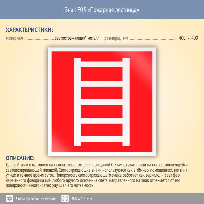 Знак F03 «Пожарная лестница» (светоотражающий металл, 400х400 мм) в Краснодаре купить