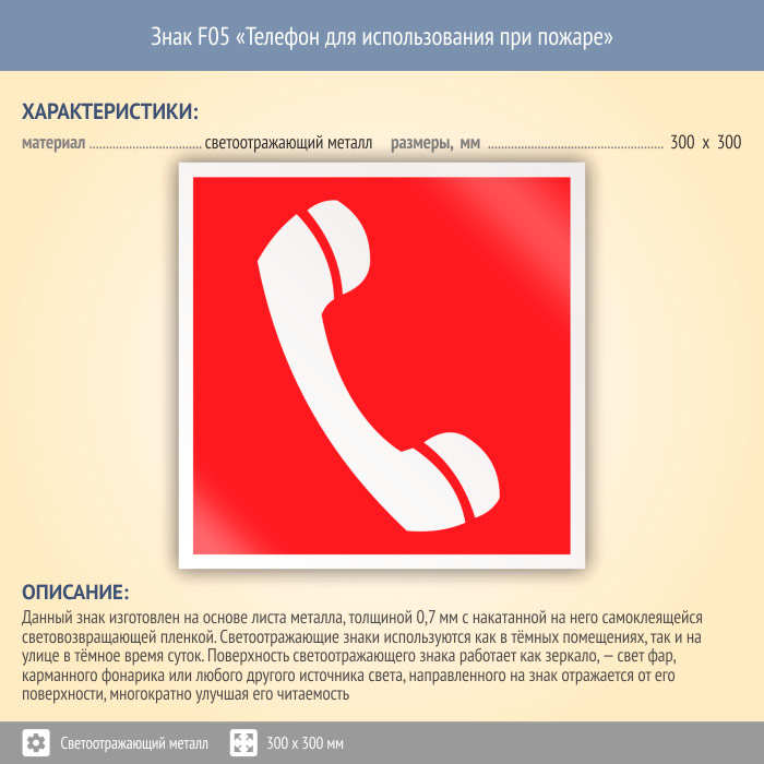 Знак F05 «Телефон для использования при пожаре (в том числе телефон прямой связи с пожарной охраной)» (светоотражающий металл, 300х300 мм) в Краснодаре купить
