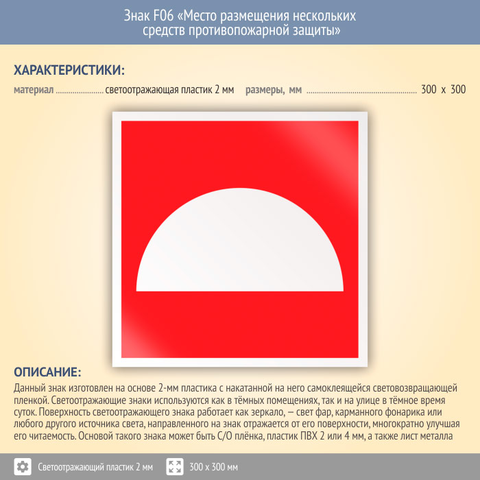 Знак F06 «Место размещения нескольких средств противопожарной защиты» (светоотражающий пластик, 300х300 мм) в Краснодаре купить
