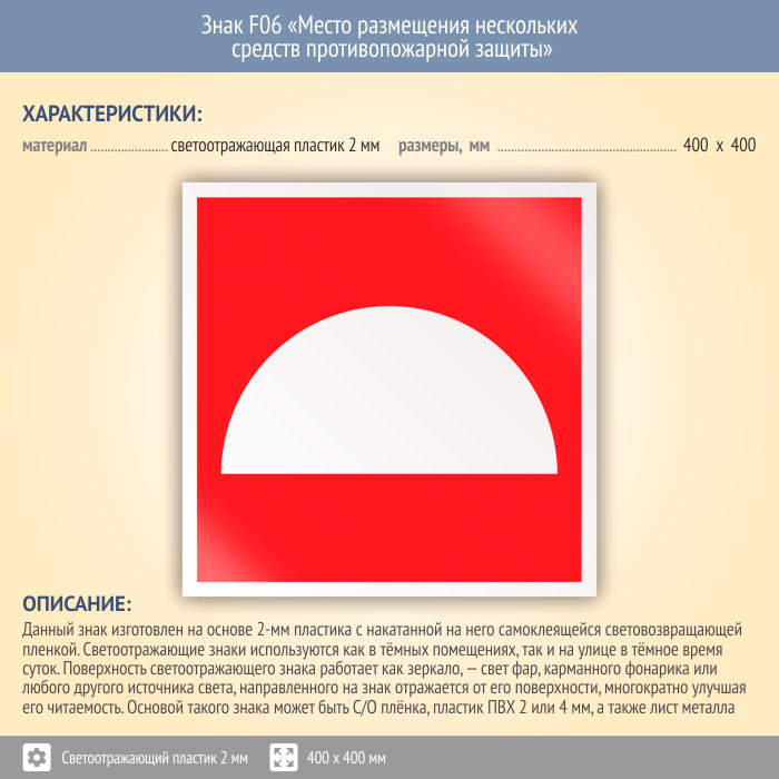 Знак F06 «Место размещения нескольких средств противопожарной защиты» (светоотражающий пластик, 400х400 мм) в Краснодаре купить