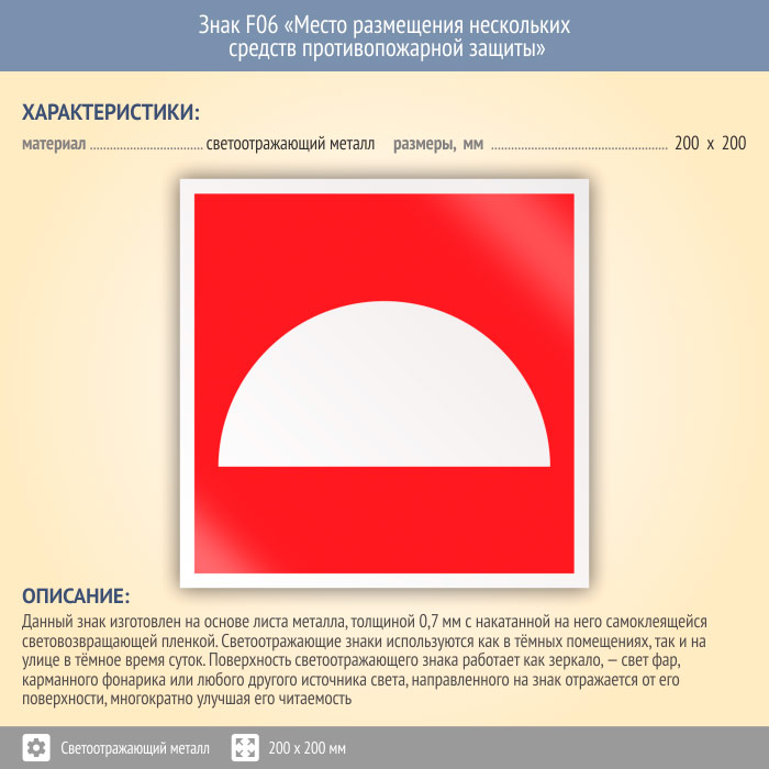 Знак F06 «Место размещения нескольких средств противопожарной защиты» (светоотражающий металл, 200х200 мм) в Краснодаре купить