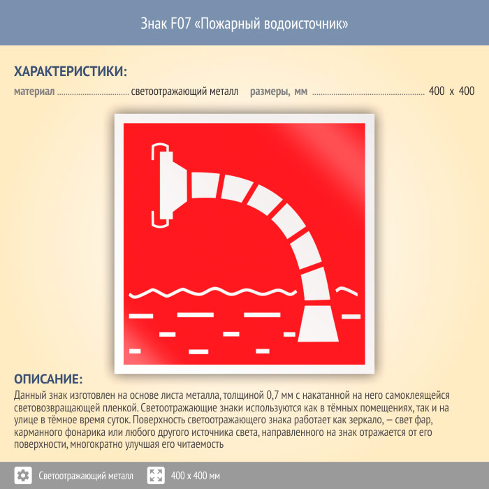 Знак F07 «Пожарный водоисточник» (светоотражающий металл, 400х400 мм) в Краснодаре купить