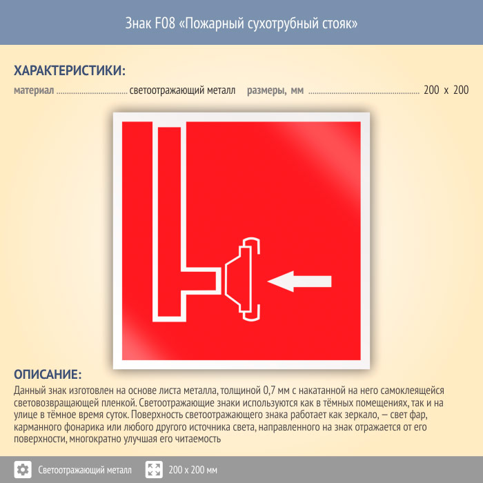 Знак F08 «Пожарный сухотрубный стояк» (светоотражающий металл, 200х200 мм) в Краснодаре купить
