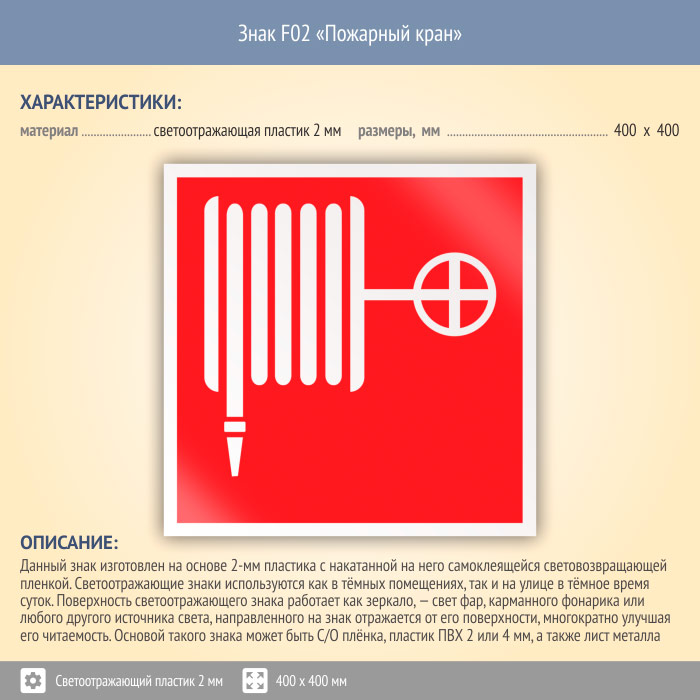 Знак F02 «Пожарный кран» (светоотражающий пластик, 400х400 мм) в Краснодаре купить