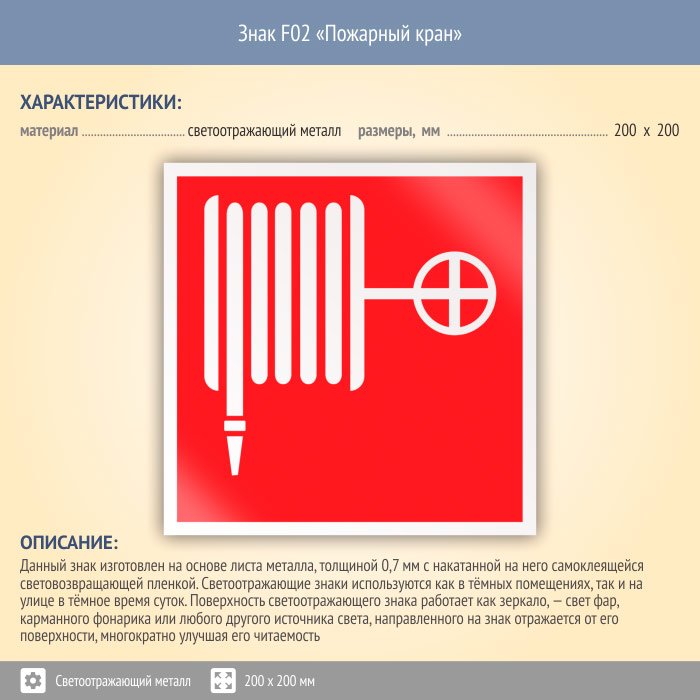 Знак F02 «Пожарный кран» (светоотражающий металл, 200х200 мм) в Краснодаре купить