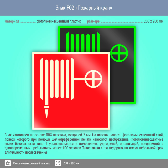 Знак F02 «Пожарный кран» (фотолюминесцентный пластик, 200х200 мм) в Краснодаре купить